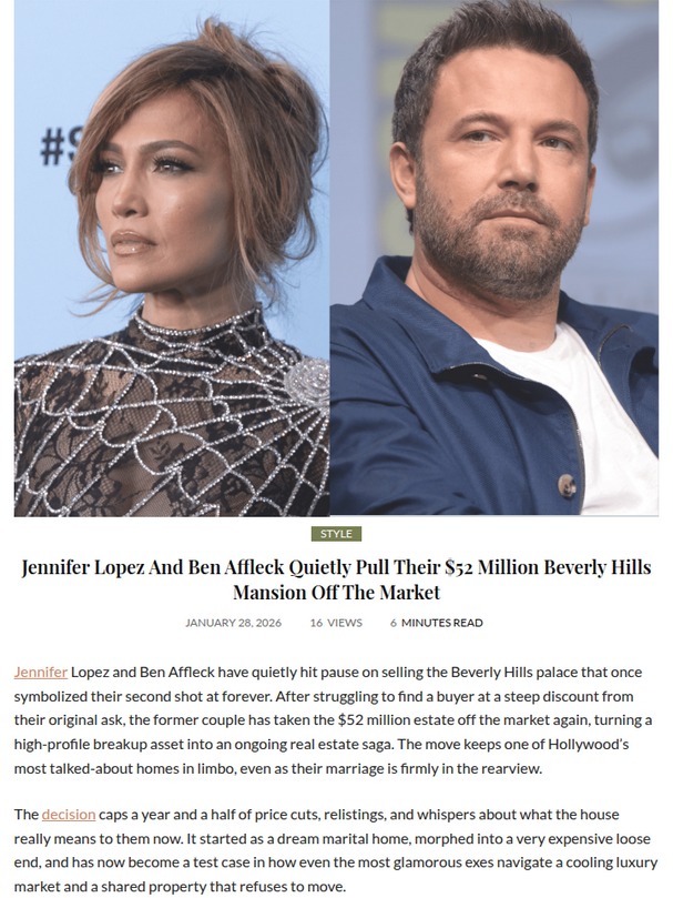 Angelica Mclaughlin+FollowHollywood’s $52M mansion standoff: What’s next?Jennifer Lopez and Ben Affleck’s $52 million Beverly Hills mega-mansion is off the market—again. After months of price cuts and no takers, the estate that once screamed “forever” for Bennifer is now a high-profile real estate headache. It’s wild to see even A-listers struggle to sell in this luxury market, with their dream home turning into a stubborn reminder of their split. Would you keep a house tied to your ex, or cut your losses? This saga really shows how, breakup or not, real estate can get personal fast—no matter who you are. #Entertainment #Celebrity #RealEstateDrama116Share