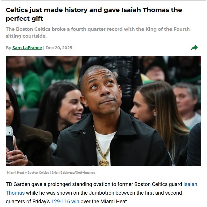 Nicole Obrien+FollowCeltics honor Isaiah Thomas with record nightBoston fans brought the house down for Isaiah Thomas at TD Garden, showing just how much he still means to the city. As IT soaked in a roaring ovation, the current Celtics squad delivered a tribute of their own—setting an NBA record with 10 made threes in the fourth quarter to blow past the Heat. It felt like a passing of the torch, with the team channeling Thomas’s legendary clutch energy. Moments like this remind us how much heart and history matter in Boston sports. What’s your favorite Isaiah Thomas memory? #Sports #Basketball #Celtics00Share
