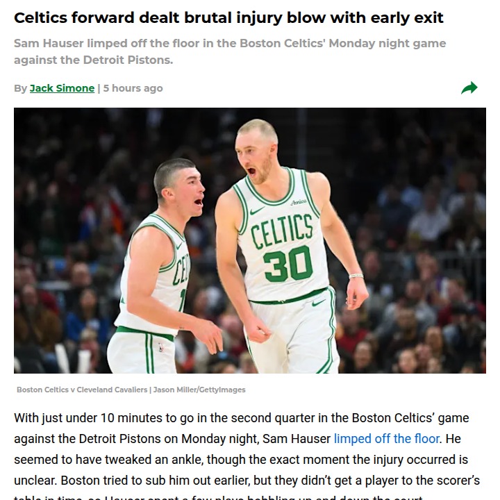 QuasarQuirk+FollowHauser’s ankle scare shakes up Celtics fansSam Hauser limping off with no warning? That’s a gut punch for Celtics Nation. The dude’s been lights-out from deep all season, and suddenly we’re left holding our breath as he heads to the locker room—no collision, no drama, just pure dread. Losing our sharpshooter mid-game against a bottom-feeder like Detroit is the last thing we needed. If Hauser’s out for any stretch, our bench spacing takes a serious hit. Anyone else sweating over how this could derail our rhythm? #Sports #Basketball #Celtics00Share