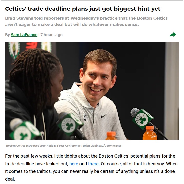 Ryan Lopez+FollowCeltics Eyeing Big Deadline Splash?Brad Stevens just dropped some classic poker face at his latest presser, but the message is clear: the Shamrocks aren’t ruling out a big move before the trade deadline. The buzz is all about whether Boston will ship out Simons to dodge the luxury tax or swing for a top-tier big man. Either way, Stevens says it’s all about the right deal. Could we see a major shakeup, or will the Jays keep rolling with the current squad? #Sports #Basketball #Celtics00Share