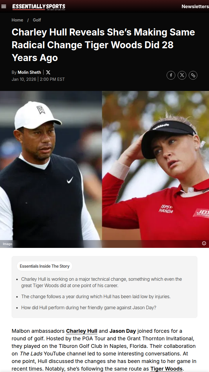 sarahgibson+FollowHull’s Tiger-Style Swing Change: Game Changer?Charley Hull is taking a page out of the Big Cat’s playbook! After battling back and ankle injuries, Hull’s now overhauling her swing—just like Tiger did back in the late '90s. She’s working on straightening her legs for more turn and less back strain, even though it feels totally weird right now. Hull put her new move to the test against Jason Day, and despite being 3 down, she only lost by one. If she keeps this up, could a major finally be in her future? #Sports #Golf #CharleyHull00Share