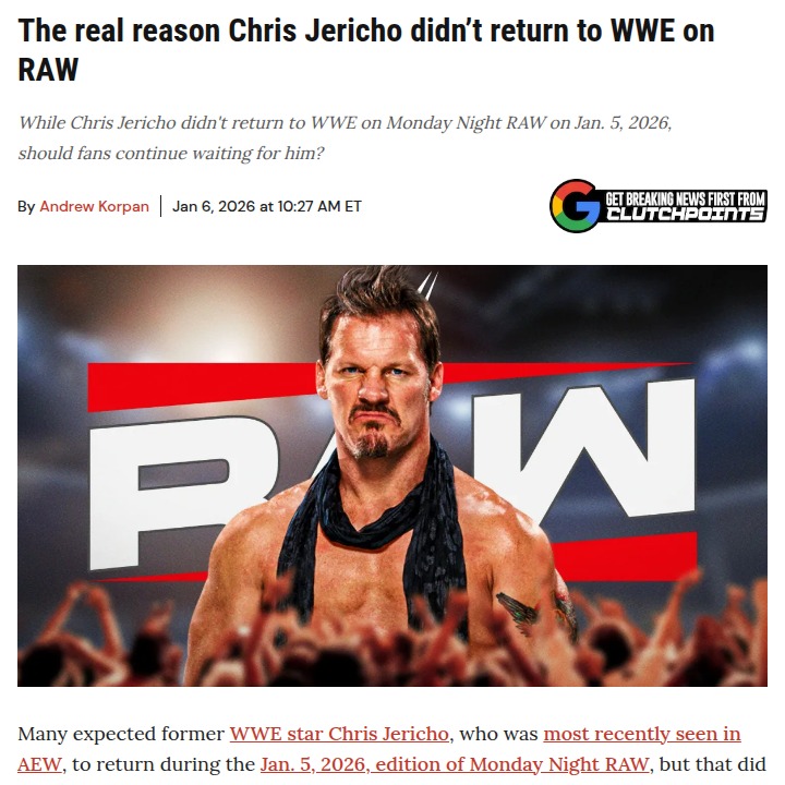 Kendra Ward+FollowJericho’s Raw No-Show: AEW or WWE Next?Talk about a swerve! Fans were hyped for Y2J to break the walls down on Raw’s big night, especially after Adam Pearce’s tease. But now it’s official: Chris Jericho isn’t showing up, and he’s still on AEW’s roster. Is this a contract snag, a strategic WWE delay, or just classic wrestling misdirection? The speculation is wild—could the Royal Rumble be the real return spot for The Ocho? #Sports #Wrestling #ChrisJericho00Share