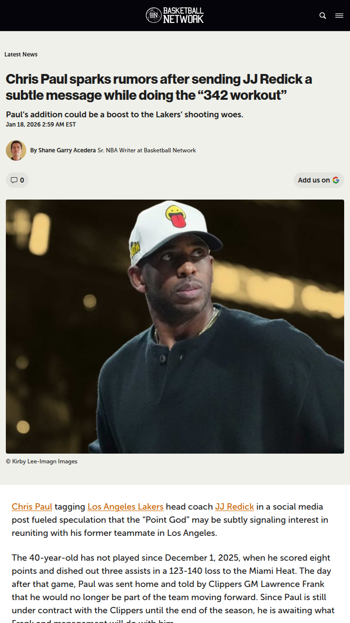 Susan Reeves+FollowCP3 Drops Hints to JJ Redick: Lakers Next?Did anyone else catch the Point God’s latest IG post? Chris Paul just tagged Lakers coach JJ Redick while grinding through the legendary “342 workout”—Redick’s signature shooting drill. With CP3 still waiting on the Clippers’ next move and the Lakers desperate for 3-point help, is this a subtle pitch for a Hollywood reunion? King James and CP3 together in purple and gold to close out a Hall of Fame career? Let’s hear your takes! #Sports #Basketball #ChrisPaul10Share