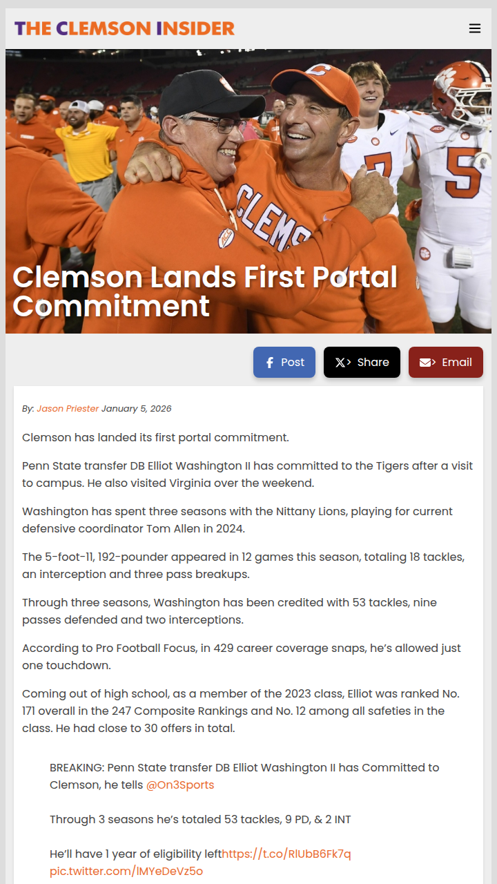 glen25+FollowClemson’s Portal Play: DB Reset BeginsTigers fans, the secondary shakeup is real! With Avieon Terrell NFL-bound and half the DB room gone, Dabo’s crew just hosted Elliot Washington II—a proven Power Five corner who played for Coach Allen at Penn State. If Washington joins, he could be a day-one impact guy, bringing much-needed experience to a young group. The portal is officially open for business in Death Valley. Thoughts on how this move stacks up in the ACC arms race? #Sports #Football #Clemson00Share