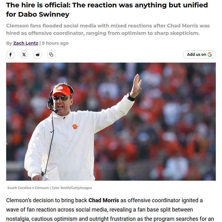 Aaron Taylor+FollowClemson’s big gamble: Chad Morris returnsClemson just made a move that’s got the whole fan base buzzing—Chad Morris is back as offensive coordinator. Some are fired up, remembering the explosive offenses he led, while others worry this is just clinging to the past instead of adapting to today’s game. The real debate? Whether this signals a bold reset or a desperate throwback. With college football changing fast—transfer portal, NIL, and all—everyone’s wondering if this is the spark Clemson needs or a step backward. What do you think: smart move or stuck in nostalgia? #Sports #Football #Clemson00Share