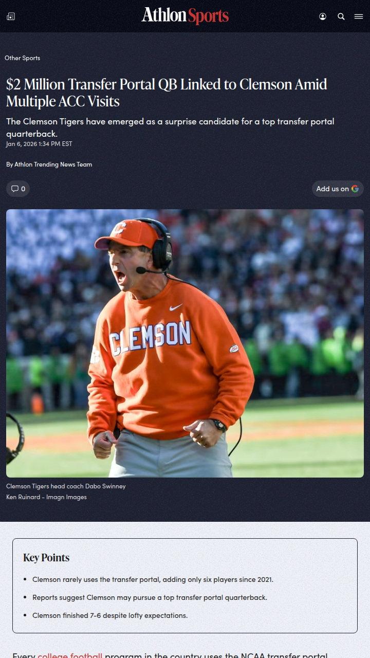Amy Williams+FollowClemson Eyes $2M Portal QB for ACC ShowdownIs Dabo finally changing his tune on the portal? Word is the Tigers are quietly in the mix for DJ Lagway, the $2 million man who’s been making the rounds in the ACC. After a rough 7-6 season, could this be the spark Clemson needs to get back on top—and maybe reignite that rivalry with FSU? Lagway’s got the arm, but can he handle the pressure in Death Valley? #Sports #Football #Clemson00Share