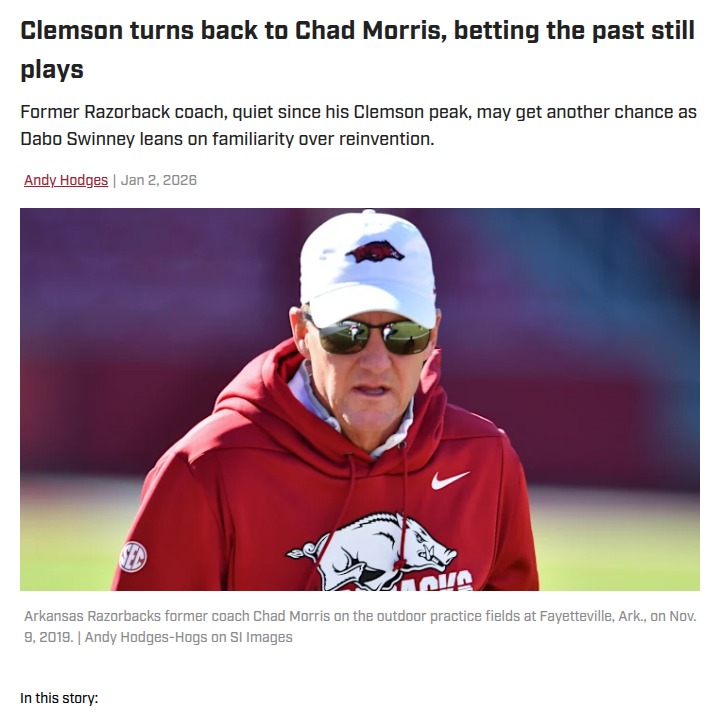 Chad Williams+FollowClemson Eyes Chad Morris ReunionTigers fans, what do we think about Dabo possibly bringing back Chad Morris to run the offense? The architect of Clemson’s early rise could be making a comeback, even though his post-Tigers résumé (looking at you, Arkansas) hasn’t wowed anyone. Is this a smart play for continuity, or is Clemson stuck in the past while the rest of college football evolves? Would love to hear if you think Morris can recapture that old magic! #Sports #Football #Clemson00Share