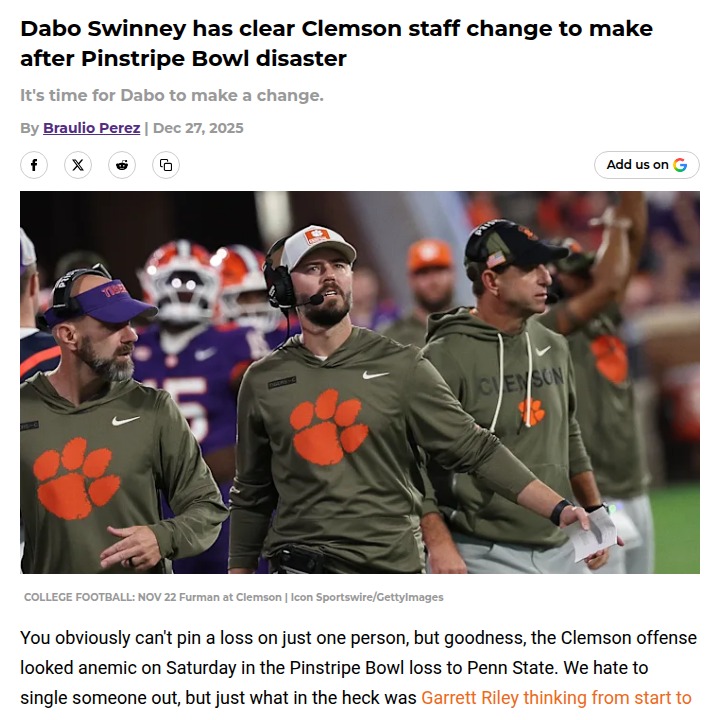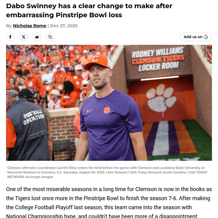 glen25+FollowClemson fans call for big changes after Pinstripe BowlClemson’s offense hit rock bottom in the Pinstripe Bowl, and fans are louder than ever about wanting a shakeup—especially at offensive coordinator. After a 22-10 loss to Penn State, frustration is boiling over about Garrett Riley’s play-calling and lack of adjustments. The Tigers finished a disappointing 7-6, and for a program used to competing for championships, that’s just not good enough. Now, all eyes are on Dabo Swinney: will he make the tough call and bring in new leadership, or stick with the current staff? What do you think needs to change for Clemson to get back on track? #Sports #Football #Clemson00Share