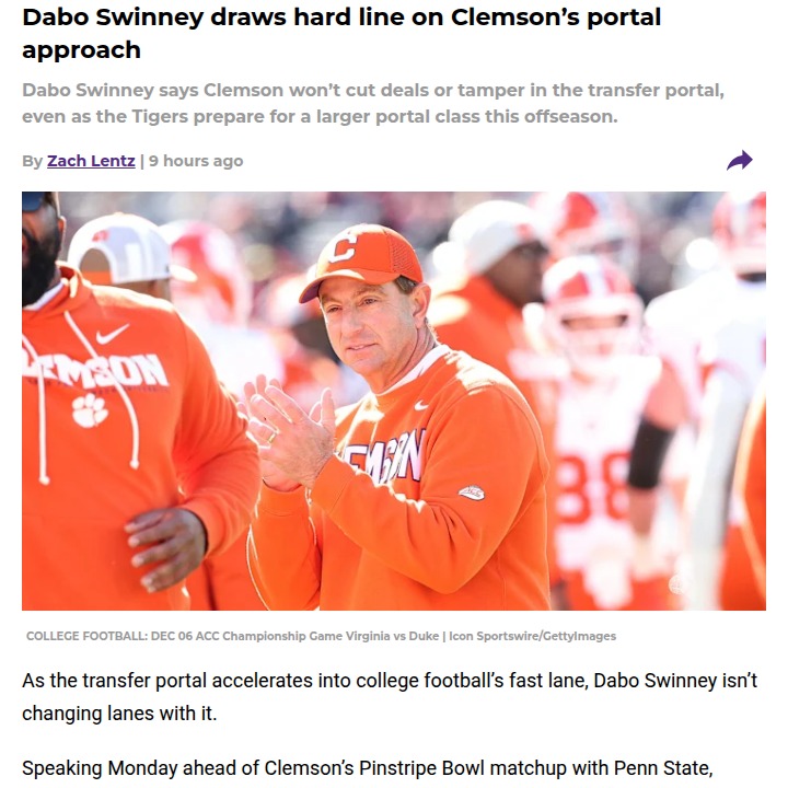 Christopher Hughes+FollowDabo Doubles Down: No Portal Deals for TigersCoach Dabo is sticking to his guns—no shady portal deals for the Tigers! While other programs might be making moves before the window even opens, Clemson’s doing it by the book. Swinney made it clear: the Tigers won’t tamper, even if it means missing out on top talent that jumps ship in minutes elsewhere. Thoughts on how this impacts our rivalry recruiting battles? #Sports #Football #Clemson00Share