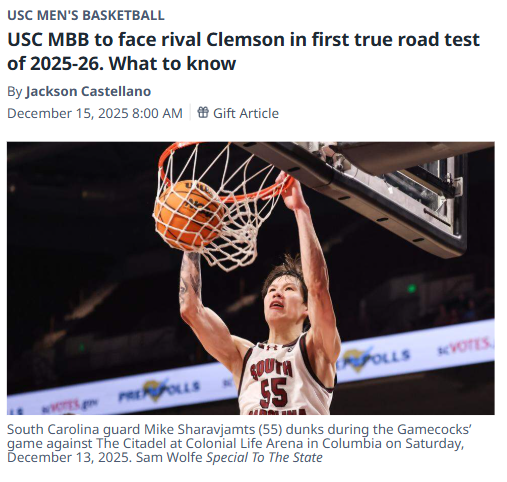 CrimsonChameleon+FollowGamecocks hit the road for Palmetto Series clashUSC’s men’s basketball team is gearing up for its first real road challenge of the season—squaring off against Clemson in the always-heated Palmetto Series. This isn’t just any game: it’s a shot at a coveted Quadrant 1 win and a big test before SEC play begins. The rivalry has been neck-and-neck lately, and with Myles Stute back in the lineup (mask and all), there’s extra buzz. Clemson’s offense is tough, but the Gamecocks are hungry. Who do you think takes this year’s bragging rights? #Sports #Gamecocks #Clemson00Share