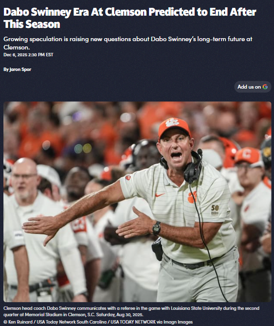 Aaron Taylor+FollowIs the Dabo Swinney Era at Clemson Over?Tiger Nation, is it really the end of the Dabo Dynasty? After a rollercoaster 7-5 season, rumors are swirling that Coach Swinney could be out at Clemson by next fall—whether by choice or not. With his massive contract and no offset clause, the buyout drama is real. If Dabo leaves, it closes a chapter of two nattys and 18 years of dominance. Are we witnessing the end, or just a tough rebuild? #Sports #Football #Clemson00Share