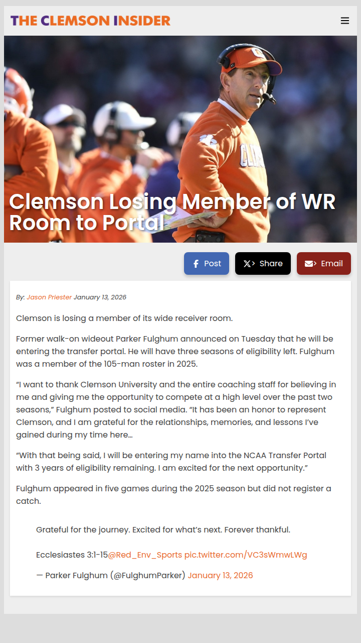 Michael Pitts+FollowClemson WR Parker Fulghum enters transfer portalBig changes are coming to Clemson’s wide receiver group as Parker Fulghum, a former walk-on, has decided to enter the transfer portal with three years of eligibility left. While Fulghum didn’t record a catch in his five appearances last season, his departure still shakes up the team’s depth and could open doors for younger talent. For fans, it’s a reminder of how quickly rosters can shift in college football. What do you think this means for Clemson’s offense next season? Who do you see stepping up? #Sports #Football #Clemson00Share