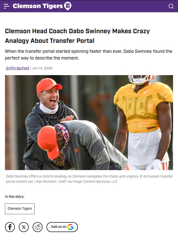 Jeffrey Armstrong+FollowDabo Swinney’s wild take on Clemson’s transfer chaosClemson’s football scene is starting to feel like a Vegas wedding chapel, at least according to head coach Dabo Swinney. He’s diving headfirst into the transfer portal this year, juggling a record number of players coming and going. Swinney insists Clemson is doing things the right way—no backdoor deals, just honest recruiting since the portal opened. With 10 new transfers already (nine on defense!), plus a new offensive coordinator and a speedy new running back, the Tigers are shaking things up after their roughest season in 15 years. What do you think—will this new approach get Clemson back on top? #Sports #Football #Clemson00Share