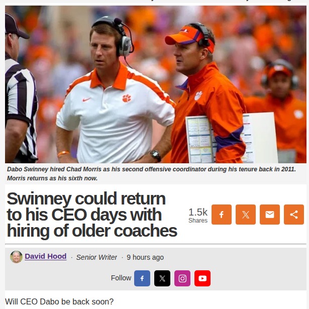 Jay Williams+FollowClemson football’s coaching shakeup: Is Dabo back as CEO?Clemson fans have noticed a big shift: Dabo Swinney is bringing in experienced, older coaches like Chad Morris and Tom Allen, hinting at a return to his CEO-style leadership. Remember when Clemson’s staff was stacked with veteran coordinators and the Tigers were a playoff fixture? Swinney’s trust in his coaches then let him focus on recruiting and big-picture strategy. Recent years saw a younger, less experienced staff—and more hands-on Dabo. With these new hires, could Clemson regain its stability and swagger? What do you think: Is this the recipe for another championship run? #Sports #Football #Clemson00Share