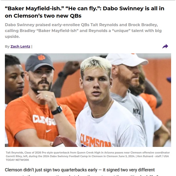 Jeffrey Armstrong+FollowClemson’s new QBs bring big-time energyClemson’s quarterback room just got a serious upgrade with two totally different playmakers. Brock Bradley arrives with a ‘Baker Mayfield-ish’ vibe—he’s a proven winner, cool under pressure, and has the stats to back it up. Then there’s Tait Reynolds, a dual-sport star with explosive speed and a knack for big plays, putting baseball on hold to go all-in on football. Dabo Swinney is fired up about the unique mix of stability and upside these guys bring. Which style do you think will define Clemson’s next era: steady and reliable, or electric and unpredictable? #Sports #Football #ClemsonFootball00Share