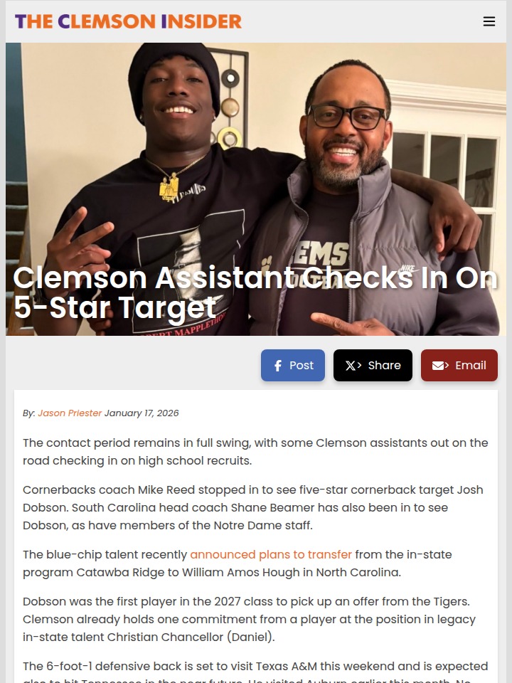 Amy Williams+FollowClemson’s recruiting battle heats up for 5-star CBClemson’s push for top talent just got more intense as cornerbacks coach Mike Reed checked in on five-star recruit Josh Dobson, who’s now transferring to William Amos Hough in North Carolina. Dobson’s drawing serious attention—South Carolina and Notre Dame coaches have already visited, and he’s got trips lined up to Texas A&M and Tennessee. With Dobson being the first 2027 prospect to get a Clemson offer, it’s clear he’s a priority. Will he make it to Clemson’s Elite Retreat next month? This recruiting race is one to watch! What do you think Dobson’s next move should be? #Sports #Football #ClemsonFootball00Share