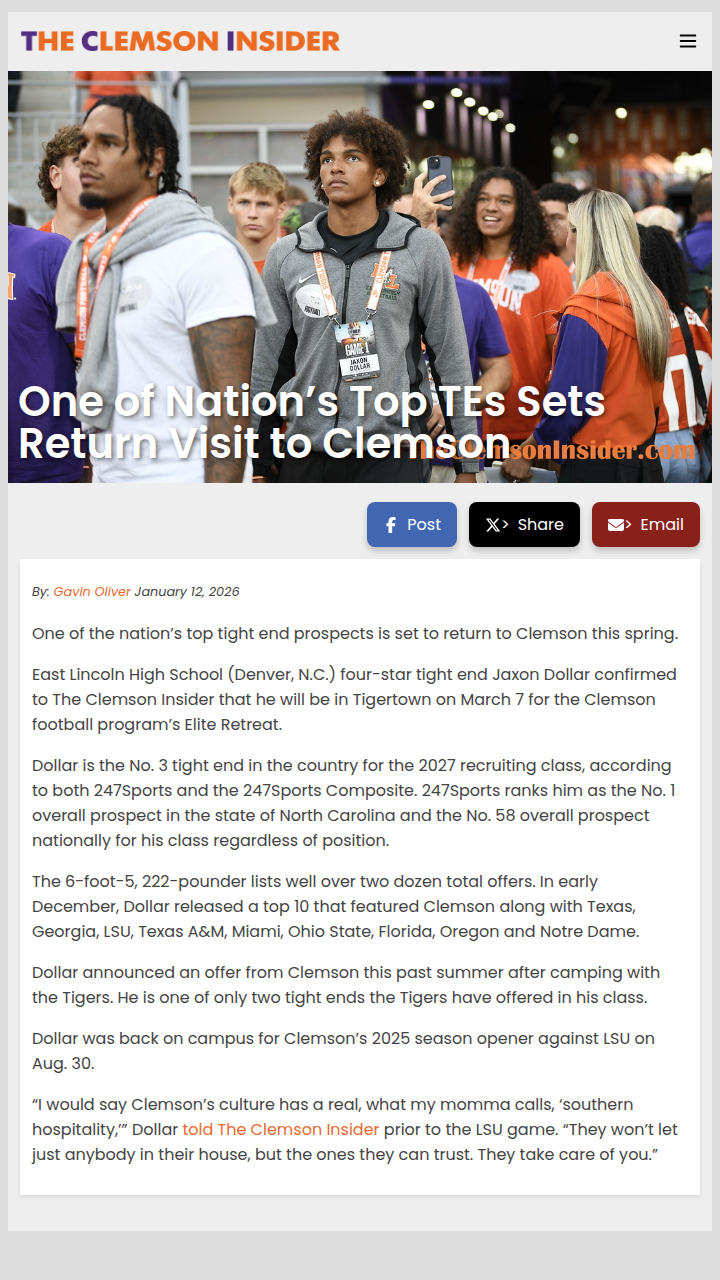 Jeffrey Armstrong+FollowClemson’s Elite Retreat draws top TE Jaxon DollarJaxon Dollar, one of the country’s most sought-after tight ends, is heading back to Clemson for the Elite Retreat on March 7. The East Lincoln High standout is ranked No. 3 nationally at his position for the 2027 class and is the top overall prospect in North Carolina. With over two dozen offers—including heavyweights like Texas, Georgia, and Ohio State—Dollar’s return visit shows just how much Clemson’s family-like culture is resonating with top recruits. What do you think sets Clemson apart in the recruiting game? Could Dollar be the next big name in orange? #Sports #Football #ClemsonFootball00Share