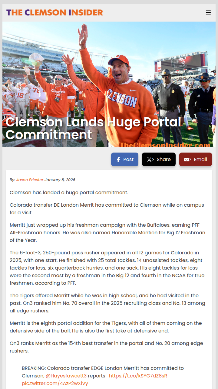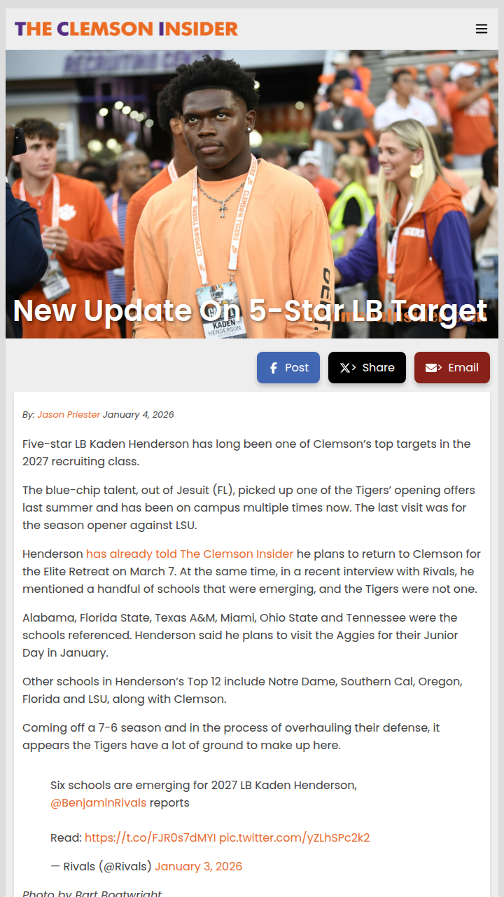 Kaden Henderson, one of the nation’s top linebacker prospects for 2027, has been a major Clemson target, but the Tigers might be slipping down his list. Despite multiple campus visits, Henderson recently named Alabama, Florida State, Texas A&M, Miami, Ohio State, and Tennessee as schools catching his eye. Clemson is still in his Top 12, but after a rocky 7-6 season and defensive changes, the Tigers have some catching up to do. What do you think Clemson needs to do to stay in the race for Henderson?