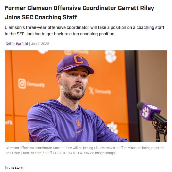 Chad Williams+FollowDabo Drops Riley: Tigers’ OC ShakeupBig news in Tiger Town—Dabo Swinney let go of Broyles Award winner Garrett Riley after Clemson’s offense sputtered in 2025, despite a promising start. Riley’s now joining Mizzou as an offensive assistant, reuniting with Eli Drinkwitz. The real drama? Clemson’s record portal haul and the return of Chad Morris as OC. Did Dabo make the right call, or was Riley a scapegoat for bigger issues? Let’s hear your takes, Tiger fans! #Sports #Football #ClemsonTigers00Share