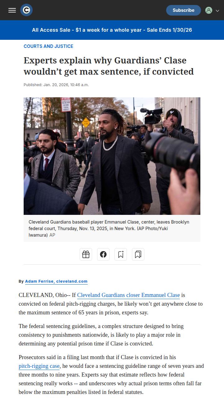 terrysharon+FollowWhy Emmanuel Clase likely avoids max sentenceCleveland’s own Emmanuel Clase, the Guardians’ star closer, faces serious federal pitch-rigging charges, but legal experts say he’s unlikely to get anywhere near the eye-popping 65-year maximum sentence. The reason? Sentencing guidelines, past cases, and his lack of criminal history all play a role. This case is sparking debate across the city: Should high-profile athletes be treated differently in the justice system? Or is the real issue how sentencing works for everyone? Curious to hear what the community thinks about fairness, accountability, and how much celebrity status matters in court. #Sports #Baseball #Cleveland00Share