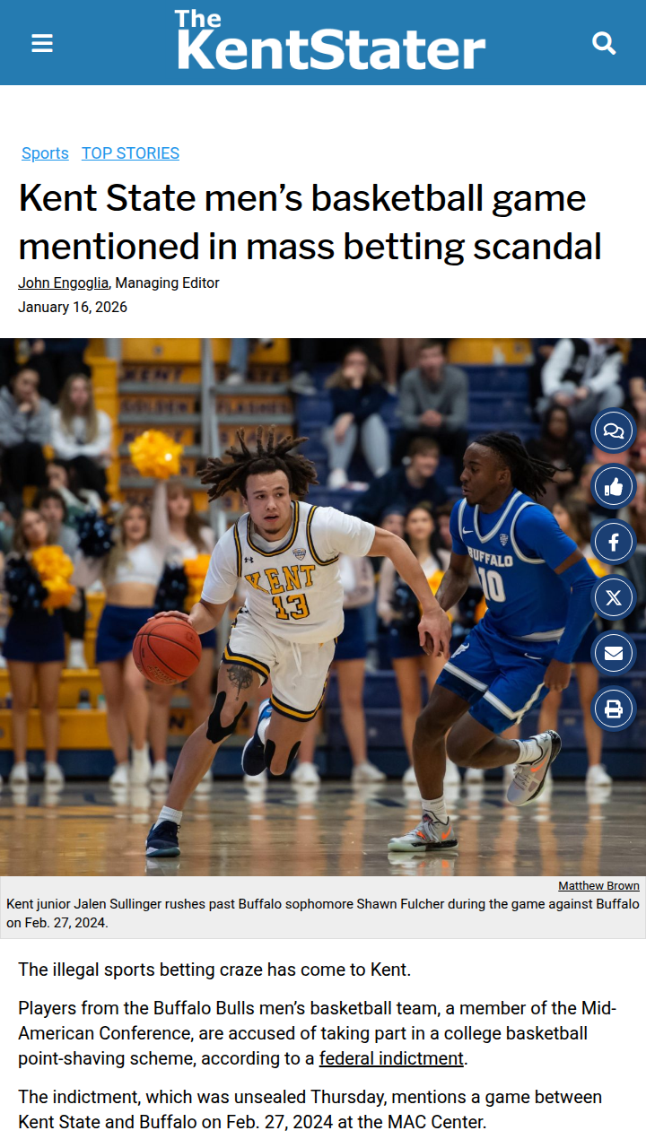 guerrajohn+FollowBuffalo Bulls Betting Scandal Rocks MACHard to believe, but the illegal betting wave has hit the MAC hard. The Buffalo Bulls are at the center of a massive point-shaving scandal, with three players accused of rigging the first half against Kent State. The Flashes went on a 12-0 run, covering the spread while Buffalo’s stars went ice cold. The feds say this wasn’t a one-off—multiple games and teams are involved. Kent State, for their part, is cleared of any wrongdoing. Thoughts on how deep this goes? #Sports #Basketball #CollegeBasketball00Share