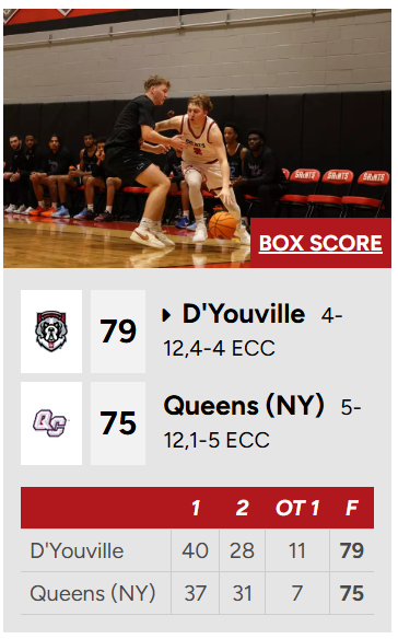 EchoingEagle+FollowSaints clinch wild OT win in QueensA nail-biter in Queens saw D’Youville’s Saints edge out Queens College 79-75 in overtime, and it was pure drama from start to finish. Sean Reynolds was on fire, draining six threes and racking up 22 points, while Elisha Warren’s relentless hustle at the line (14-for-17 on free throws!) kept the Saints in control. The Knights kept coming back, tying it at 68 with seconds left, but the Saints’ defense and clutch shooting in OT sealed the deal. With this momentum, can D’Youville take down No. 2 Daemen next? Let’s hear your predictions! #Sports #DYouville #CollegeBasketball00Share