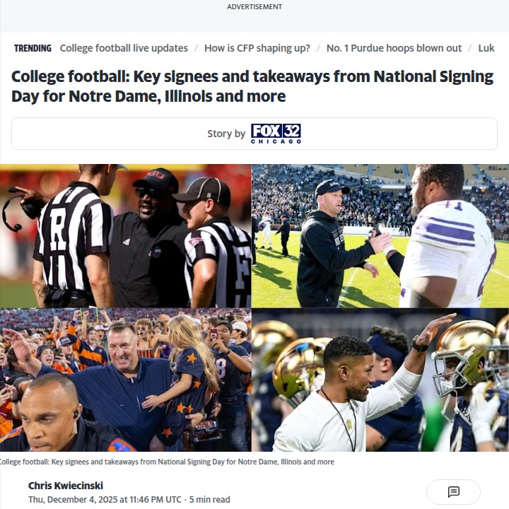 glen25+FollowNotre Dame, Illinois, and Northwestern land game-changersBig moves on National Signing Day are shaking up college football futures for Notre Dame, Illinois, and Northwestern. Notre Dame’s recruiting class is stacked, landing four five-star prospects and locking in all their verbal commits—momentum that could keep them in the national title conversation. Illinois just matched its highest-ever recruiting class ranking, flipping top talent from UCLA and setting up for more Big Ten wins. Northwestern is building a foundation with standout local talent, especially at quarterback. Which program do you think made the biggest leap, and how will these new faces change the game next season? #Sports #Football #CollegeFootball00Share