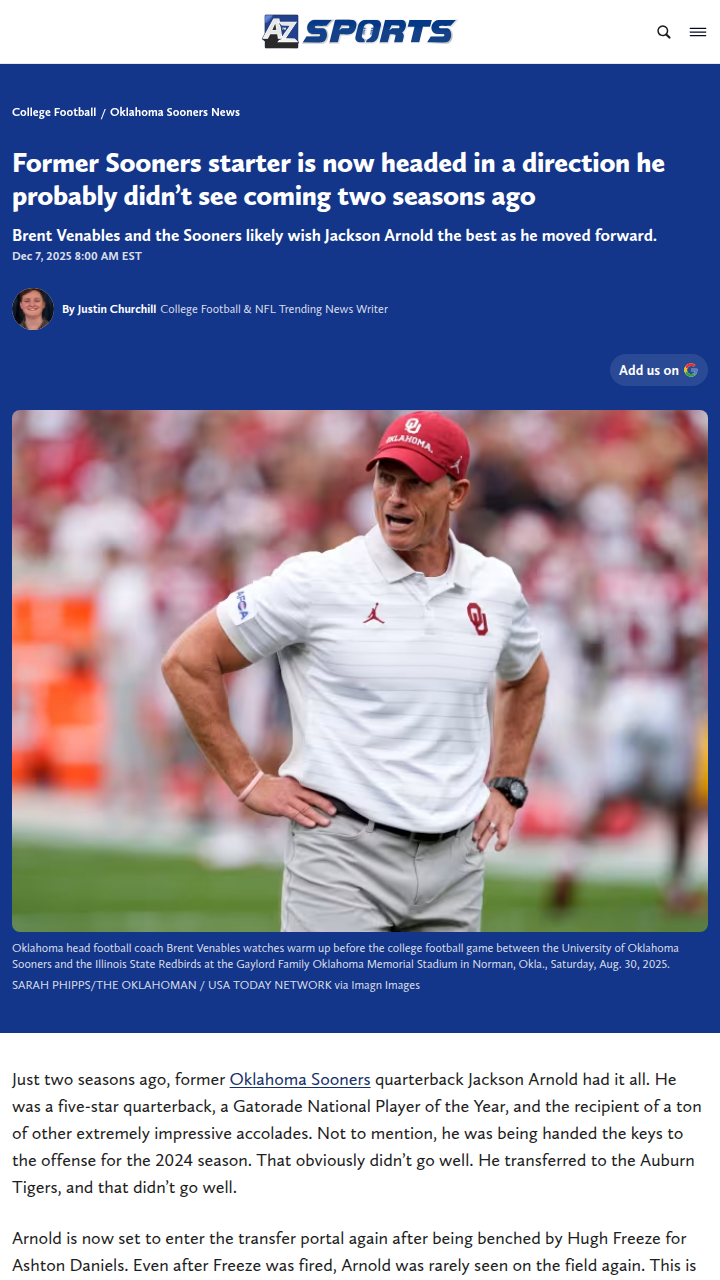 Jay Williams+FollowJackson Arnold’s wild ride: What’s next?Jackson Arnold’s journey from five-star recruit and Oklahoma’s future QB to back-to-back transfer portal entries is a reminder of how unpredictable college football can be. After a tough stint at Auburn, Arnold’s next move is up in the air—will he land a starting job at a smaller school, or even switch positions to maximize his athleticism? The blame for his struggles doesn’t fall squarely on his shoulders; poor offensive schemes and injuries played a big part. It’s tough to see such a talented player searching for a fit. Where do you think Arnold should go from here? #Sports #Football #CollegeFootball00Share