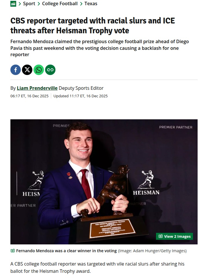 Jacob Morris+FollowHeisman 2025: Pavia’s Outburst & Voter BacklashWild scenes after the Heisman Trophy 2025! Fernando Mendoza took home the hardware, but all eyes are on Diego Pavia’s heated social media reaction and the ugly backlash CBS’s Shehan Jeyarajah faced for his ballot. Jeyarajah, a first-time voter, picked Pavia over Mendoza, sparking a storm of racial abuse and even ICE threats online. Pavia’s apology came quick, but will this controversy impact his draft stock? Mendoza, meanwhile, stays humble and looks set for the NFL’s top pick. Thoughts on the voting process and fan reactions? #Sports #Heisman2025 #CollegeFootball00Share