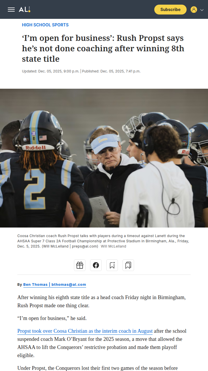 glen25+FollowRush Propst’s wild ride brings Coosa Christian first state titleRush Propst just led Coosa Christian to its first-ever state football championship, and he’s not ready to hang up his whistle yet. After stepping in as interim coach and overcoming a rocky start, Propst guided the team to 13 straight wins and a dramatic title victory. With eight state championships under his belt and over 300 career wins, Propst says he’s still got years left in him—whether that’s at Coosa or somewhere new. What do you think: Should Coosa keep Propst, or bring back their original coach? #Sports #Football #CoosaChristian00Share