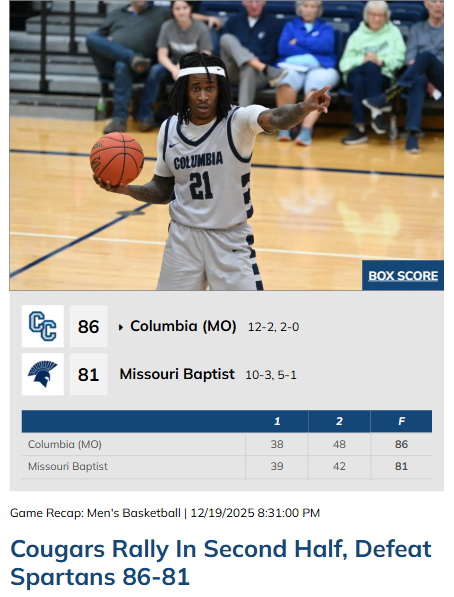 CrimsonChameleon+FollowCougars catch fire in second half for big winColumbia College’s basketball squad turned a tight game into a thrilling victory, lighting up the court after halftime and leaving Missouri Baptist in the dust. Johnny Anderson was unstoppable, nailing six threes and dropping 26 points, while Jemeal Goines and Adam Sausele each hit season highs. The Cougars’ offense was on another level in the second half, shooting over 54% and hitting threes at a scorching 62.5%. With clutch free throws and smart ball handling, Columbia pulled away late. What do you think sparked their second-half surge—and can they keep this momentum rolling? #Sports #ColumbiaCollege #Cougars00Share