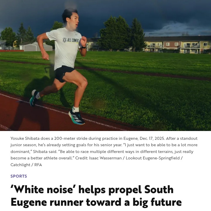 Jacob Morris+FollowSouth Eugene’s Yosuke Shibata runs on white noiseYosuke Shibata, a junior at South Eugene High, finds his focus in the chaos—literally. During big races, he tunes out everything except a calming white noise in his head, a trick that’s helped him win the state 6A cross-country title and place 23rd at Nike Cross Nationals. Off the track, he’s just as passionate about hiking the Pacific Northwest, soaking up the rain and mountain air. Shibata’s coach sees huge potential, but what stands out most is how Yosuke leads by example and keeps running fun. How do you find your own ‘flow state’ when the pressure’s on? #Sports #SouthEugene #CrossCountry00Share