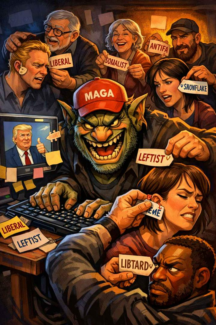 This image is for the people who can’t engage with ideas, only labels. The frantic trolls who sit behind keyboards slapping ear tags on anyone who doesn’t worship their political idol. Call me whatever if it helps you sleep at night — liberal, leftist, snowflake — it’s lazy thinking masquerading as confidence. I don’t belong to your boxes. Slapping labels on people isn’t intelligence, it’s fear, and the harder you cling to it, the more obvious it becomes that you’ve got nothing real to say. #NoLabels #ThinkForYourself #LazyThinking #LabelingIsFear #IdeasOverIdols #KeyboardWarriors #InternetTrolls #BadFaithPolitics #EchoChamber #DigitalRot #DemocracyNotDemagogues #CultOfPersonality #PoliticalTribalism #AuthoritarianVibes #PropagandaBrain #PoliticalArt #VisualSatire #ArtAsCritique #CartoonWithTeeth