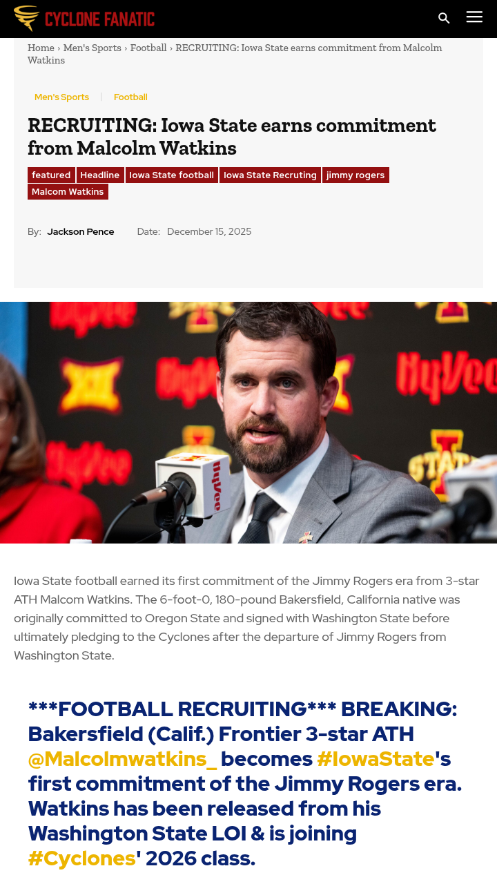 Chad Williams+FollowCyclones Land Speedster Watkins for 2026Big news for Cyclone Nation! Iowa State just scored its first commitment of the Jimmy Rogers era with 3-star ATH Malcolm Watkins. The California burner, known for his sub-11.0 100m speed, flipped from Washington State after Rogers’ departure. Watkins racked up 775 yards and 9 TDs last fall—could he be the next game-changer in Ames? Let’s talk: how does this impact the Cyclones’ rivalry outlook in the Big 12? #Sports #Football #Cyclones00Share