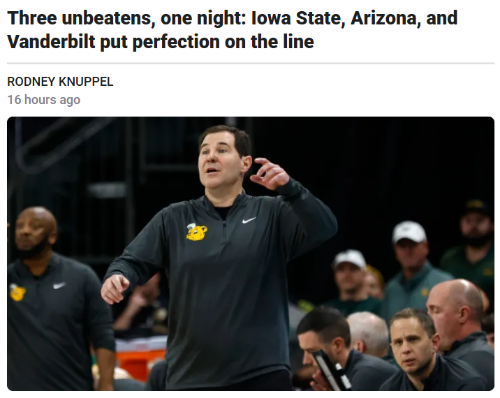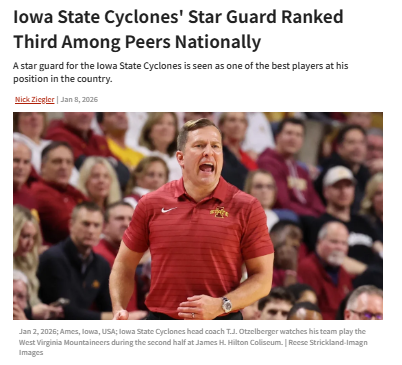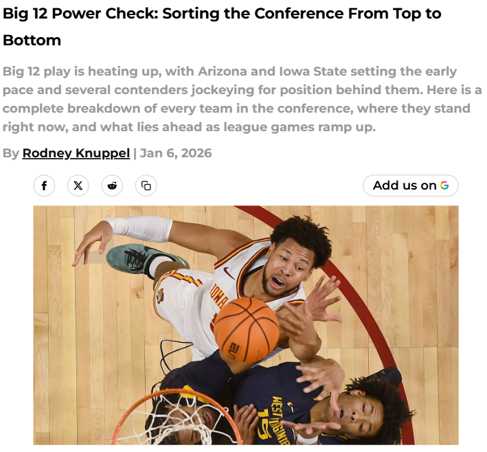 EchoingEagle+FollowBig 12 Shake-Up: Cyclones Stay Perfect!The Big 12 is already living up to its rep as a gauntlet! The Iowa State Cyclones just made a statement, staying unbeaten after torching West Virginia behind Milan Momcilovic’s eight threes and a Jefferson triple-double. Meanwhile, Arizona and Houston are right on their heels, but every game feels like a rivalry in this league. Who’s your pick to break the Cyclones’ streak? Let’s hear your takes! #Sports #Big12 #Cyclones00Share