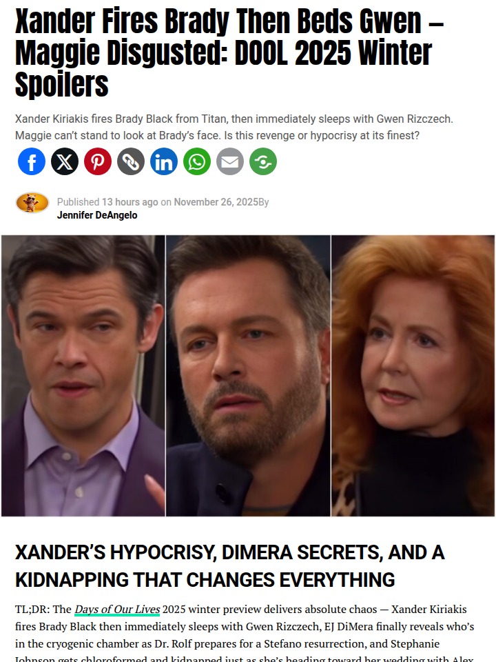 tmendez+FollowSalem’s wildest winter: Betrayals, secrets, and a jaw-dropping returnXander just fired Brady for dating his ex—then immediately hooked up with Gwen, leaving Maggie furious at the wrong guy. Meanwhile, the DiMera family is about to unleash chaos: a crypt full of secrets, a possible Stefano resurrection, and a chilling family declaration. And just as Stephanie finally finds happiness, she’s kidnapped—possibly by a villain from her past. With betrayals, resurrections, and shocking twists, Salem’s winter is set to explode. Who do you think is the real villain this season? Let’s hear your wildest theories! #Entertainment #TVSeries #DOOL80Share