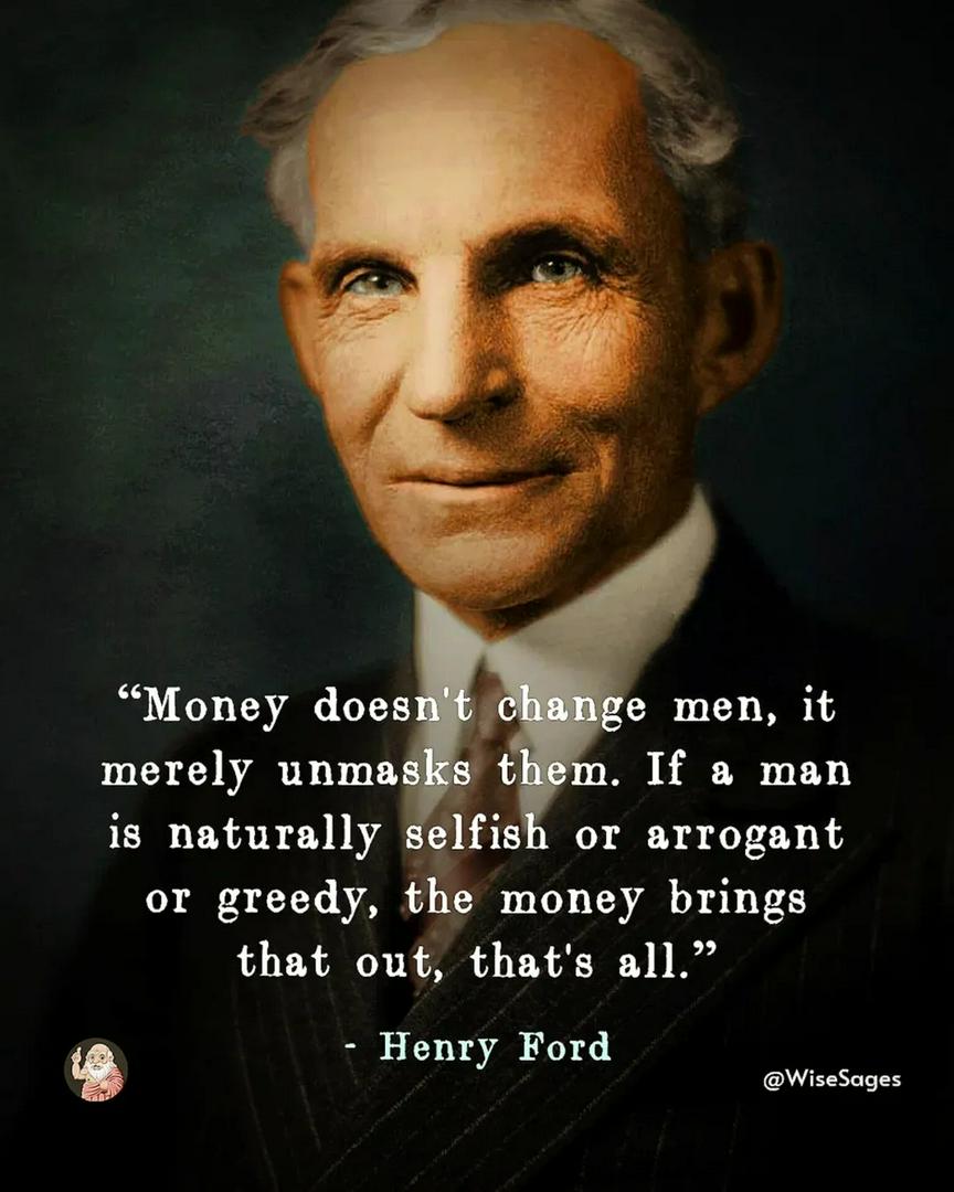 Memorable+FollowDownload 💯 Wealth doesn’t transform character, it simply reveals it. Someone who is generous, humble, or kind will carry those qualities into abundance, while someone driven by greed or ego will only have those traits magnified. Money gives people the freedom to act more fully on who they already are, stripping away the disguises necessity once forced them to wear. Would you agree? Comment your thoughts 💭... Follow @WiseSages for daily wisdom 🦉 . . #henryford #deepthoughts #deepqoutes #thoughtoftheday #psychologyofmoney23168Share