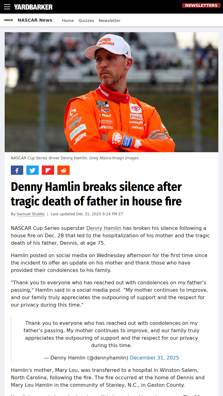 Kyle Bennett+FollowDenny Hamlin faces heartbreaking family tragedyA devastating house fire in Gaston County has taken the life of Denny Hamlin’s father, Dennis, and left his mother, Mary Lou, fighting for her life. For NASCAR fans, this hits especially hard—Denny has often credited his parents for fueling his legendary racing career. The cause of the fire is still unknown, and the community is rallying around the Hamlin family. It’s a tough reminder of how quickly life can change, even for those in the spotlight. How do you think the NASCAR community can best show support during such a difficult time? #Sports #Racing #DennyHamlin30Share