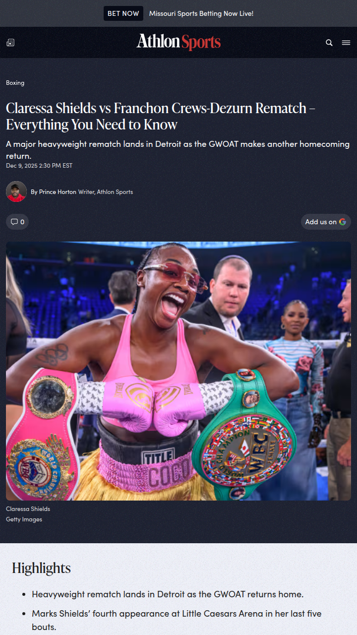 Stacie Lee+FollowDetroit’s boxing showdown: Shields vs Crews-DezurnClaressa Shields is bringing the heat back to Detroit this winter, defending her undisputed heavyweight titles at Little Caesars Arena in a rematch nearly a decade in the making. Shields, fresh off an $8 million deal, faces Franchon Crews-Dezurn—the only other woman who’s matched her grit since their pro debuts in 2016. Crews-Dezurn, now a world champ herself, is stepping up to heavyweight for the first time, looking to flip the script on her first career loss. This isn’t just a fight; it’s a homecoming, a rivalry, and a Detroit sports moment. Who’s got the edge this time? #Sports #Wrestling #DetroitBoxing00Share