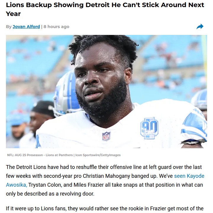 Aaron Taylor+FollowLions fans want Frazier at left guard next seasonDetroit’s offensive line has been a revolving door lately, but the numbers don’t lie—Kayode Awosika just isn’t making the cut at left guard. Despite a couple of decent games, his struggles in pass protection and run blocking have been hard to ignore, especially when compared to rookie Miles Frazier’s potential. With Christian Mahogany still sidelined, many in the community are calling for Frazier to get more snaps and develop into a long-term solution. Do you think it’s time for the Lions to move on from Awosika and invest in the rookie? Let’s hear your thoughts! #Sports #Football #DetroitLions00Share