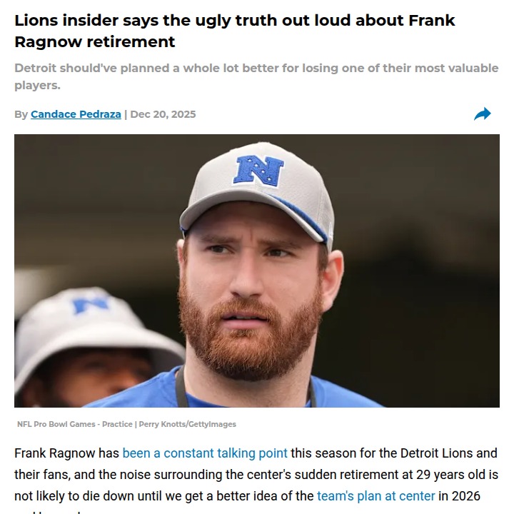 Christopher Hughes+FollowDetroit Lions’ center crisis: What’s next?Losing Frank Ragnow at just 29 has thrown a wrench into the Lions’ plans, and it’s not just about missing a star player. The real issue is how Detroit didn’t have a solid backup plan, even though Ragnow had been hinting at retirement. Now, the team’s once-dominant offensive line is scrambling, and fans are left wondering if the front office dropped the ball. With Taylor Decker also making retirement noises, are we looking at a bigger problem for the Lions’ future? How do you feel about the team’s approach to succession planning? #Sports #Football #DetroitLions02Share