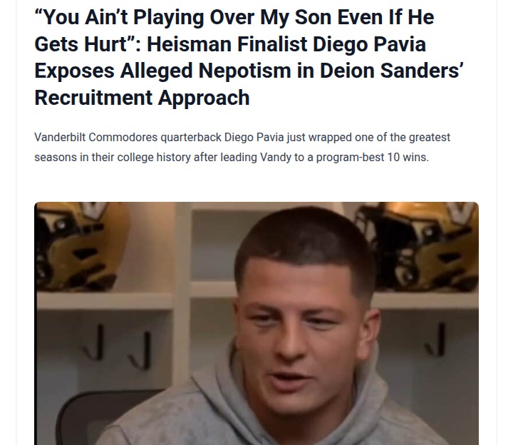 glen25+FollowDiego Pavia Calls Out Coach Prime’s NepotismDid you catch Diego Pavia’s story about Coach Prime’s recruiting tactics? On The Pivot, Vandy’s Heisman finalist revealed Deion Sanders told him straight up: “You ain’t playing over my son, even if he gets hurt.” That’s some next-level honesty, but also pure nepotism—no real QB battle at Jackson State. Pavia turned down the offer, bet on himself, and led the Commodores to a historic season. Do you respect Coach Prime’s transparency, or is this a bad look for college football? #Sports #Football #DiegoPavia01Share