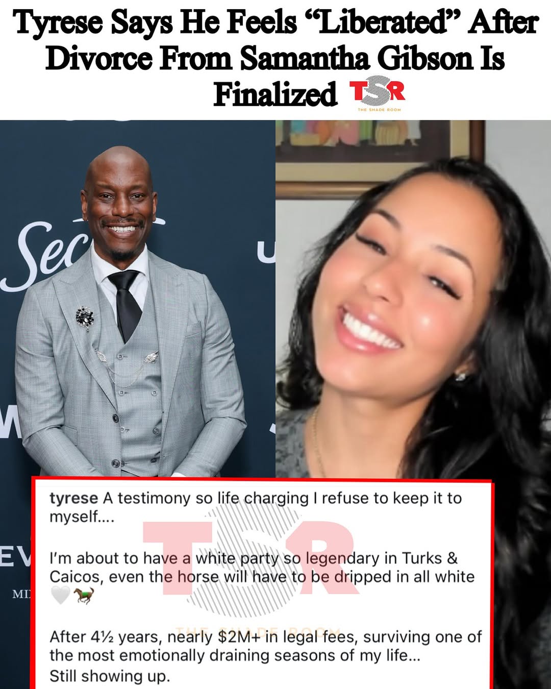 Joshua Freeman+FollowTyrese’s $2M Divorce Saga Is Finally OverTyrese just dropped a bombshell on IG—his 4.5-year divorce battle with Samantha Gibson is officially done. He says he spent nearly $2 million in legal fees and felt $50 million in public drama, but now he’s calling it a wrap. Tyrese is celebrating with a legendary white party in Turks & Caicos and says he’s feeling liberated. Fans are hyped for his next album, and the comments are wild. Divorce drama: exited! #Relationships #Tyrese #DivorceDrama274Share