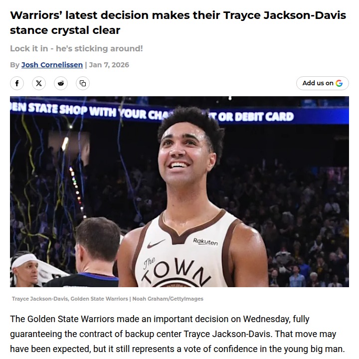 Theresa Boyd+FollowWarriors Double Down on TJD’s PotentialDubs fans, the front office just made it official—Trayce Jackson-Davis (TJD) is sticking around! By fully guaranteeing his contract, the Warriors are showing real faith in the young big man, even if he’s still fighting for consistent minutes. It’s a smart cap move too, since replacing him would be tough with the current salary crunch. Could TJD be a trade chip later, or will he step up and earn more run? Let’s see how this plays out! #Sports #Basketball #DubNation00Share