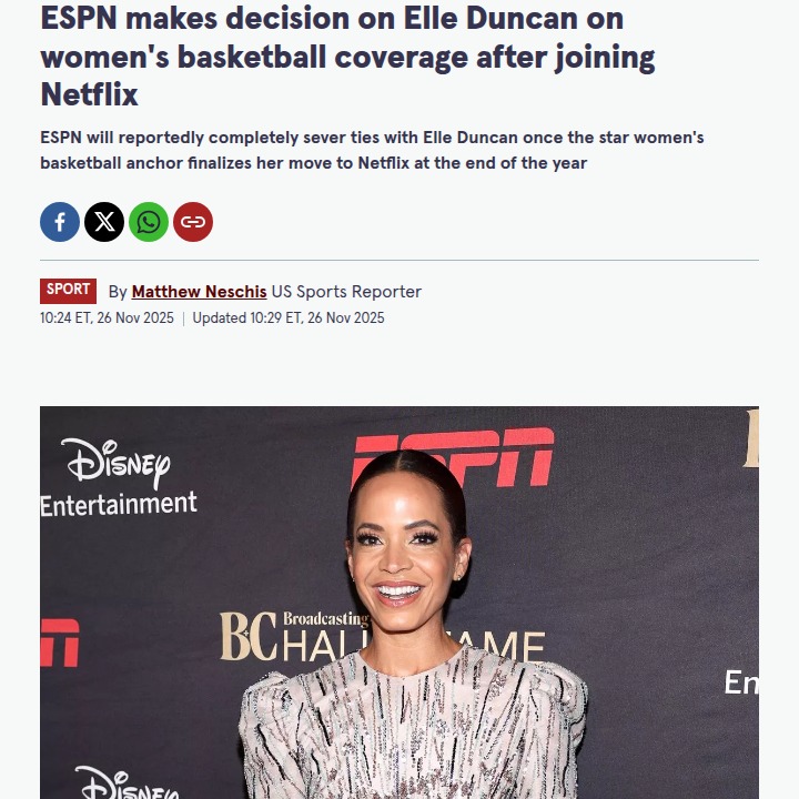 davidsonbrandon+FollowElle Duncan Leaves ESPN for Netflix SportsBig news in the women’s hoops world: Elle Duncan, who’s been the voice of College GameDay and WNBA Countdown, is officially parting ways with ESPN to join Netflix’s growing sports squad. After her no-holds-barred takes on the WNBA this summer, this move is stirring up plenty of chatter. With Duncan gone, expect a fierce battle among ESPN talent to fill her shoes. What do you think—will Netflix let her shake things up even more? #Sports #ElleDuncan #WNBA10Share