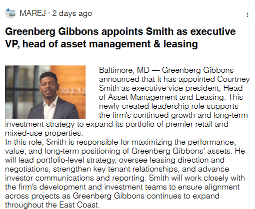 Edward Wallace+FollowBig changes at Greenberg Gibbons: New leadership aims for growthGreenberg Gibbons just made a bold move by bringing Courtney Smith on board as executive VP and Head of Asset Management & Leasing—a role created to supercharge their East Coast expansion. Smith’s got a strong track record with major retail portfolios, and he’ll be focusing on boosting property performance, strengthening tenant relationships, and keeping investors in the loop. With new projects like the $500M Midtown64 in Richmond underway, it looks like the company is gearing up for some serious growth. What do you think this means for the future of local retail and mixed-use spaces? #Business #EntrepreneurshipStartup #BaltimoreBusiness00Share