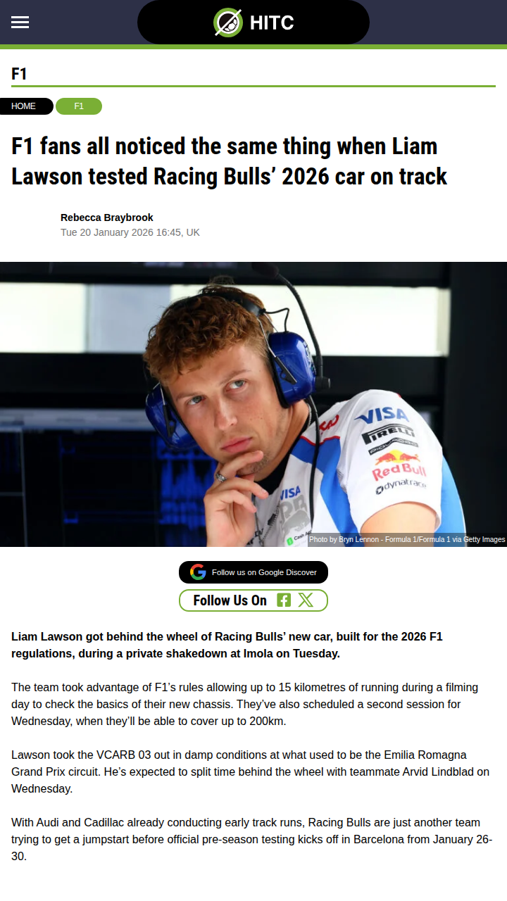 Jeremy Campbell+FollowRacing Bulls’ Airbox Sparks F1 Fan DebateDid anyone else catch the size of the air intake on the Racing Bulls’ 2026 VCARB 03 during Lawson’s shakedown at Imola? That thing’s massive—even Karun Chandhok was stunned! With the Red Bull Powertrains engine now in play, it looks like cooling is a big concern under the new regs. Can the Bulls out-cool Audi and Cadillac, or will this ‘coffee table’ airbox haunt them in Barcelona? #Sports #Racing #F100Share