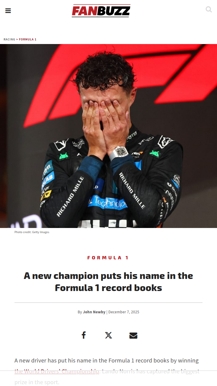 lisa79+FollowLando Norris Clinches First F1 Title!What a wild finish to the F1 season! Lando Norris finally brought it home for McLaren, sealing his first Drivers' Championship after a clutch drive in Abu Dhabi. King Lewis Hamilton was all class, giving Lando some pre-race wisdom and cheering him on. After that heartbreak in Qatar and the Dutch GP, Norris bounced back like a champ, holding off Mad Max and his own teammate. Anyone else get chills seeing Lando in tears at the finish? #Sports #Racing #F100Share