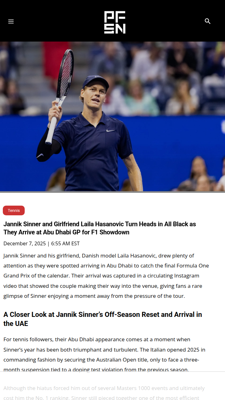 andersonkaren+FollowSinner’s Off-Season Glow at Abu Dhabi GPAnyone else spot the Iceman Jannik Sinner and Laila Hasanovic turning heads at the Abu Dhabi Grand Prix? After a wild season—winning two Slams but losing the No. 1 spot due to that controversial suspension—Sinner’s been making headlines off the court too. His courtside romance with Laila has fans buzzing, especially after their stylish all-black arrival at Yas Marina. Is this the ultimate off-season reset for Sinner before another big run in 2026? #Sports #JannikSinner #F100Share