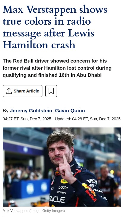 qglover+FollowVerstappen’s Classy Move After Hamilton CrashWow, talk about sportsmanship! After Sir Lewis spun out in Abu Dhabi qualifying, Mad Max was quick to check on his old rival over the radio. Even with the championship on the line and Norris breathing down his neck, Verstappen’s first thought was Hamilton’s safety. Meanwhile, King Lewis is still searching for answers in what he’s called his ‘worst season ever.’ This rivalry keeps delivering drama, but today, respect took the spotlight. #Sports #Racing #F110Share